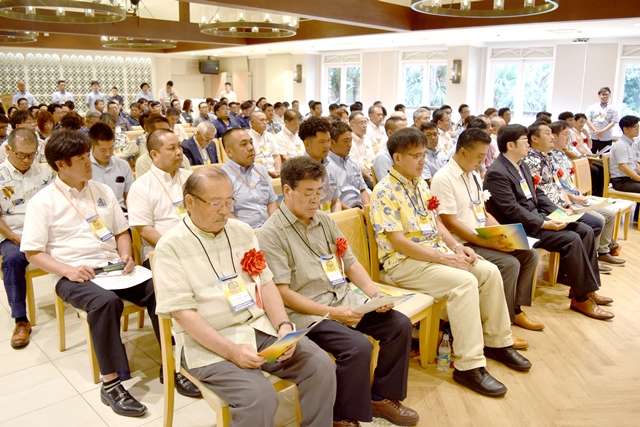 次いで市長メッセージを代読した長濱政治副市長も「伊良部大橋が完成したころから発展の潮目が変わってきた。変化を遂げる社会にあって、今後も地域のリーダーとなるべく頑張ってください」と祝辞とあわせ激励した。式典後は祝賀会が催され、酒宴の乾杯を重ねながら今後の交流を誓い、会話に花を咲かせていた。