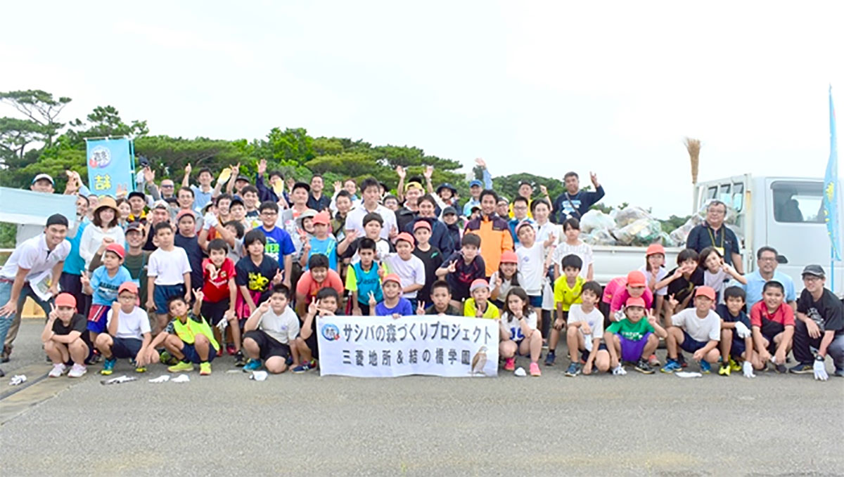 サシバの森は、 伊良部島と下地島を結ぶたいこ橋から約1㌶の範囲のテリハボクやマツなど木々が生い茂る市有地。 日本自然保護協会と宮古野鳥の会が事前調査を行い、 渡りをするサシバの中継地としてだけでなく、 越冬するサシバ (すまばんだか) が確認されている。 近年は不法投棄されたゴミや外来種のギンネムが繁殖し、 サシバの飛来と生息を妨げているという。この日の森づくり活動となる清掃作業では3つのグループに分かれて開始。 三菱地所グループや下地島エアポートマネジメントの社員が木々の中に入りゴミを拾い、 児童たちが分別を行った。 ゴミの中には空き缶やビニールだけでなく、 テレビや家庭用照明機器などの不法投棄されたゴミもあった。 当初はゴミ拾いとギンネムの除去を予定していたがゴミの量が多く、 ギンネムの除去は出来なかった。