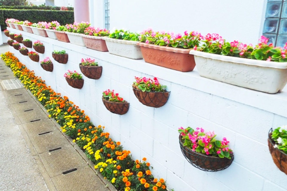 花の種類はインパチェンス、 ベゴニア、 ゼラニウムなどが見られ、 道路と塀のわずかな隙間を利用し、 黄色やオレンジ色のマリーゴールドも植えられて通行人の目を楽しませている。