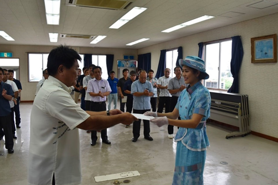 市長代理で上下水道部の兼島方昭部長から辞令を受けたミスブーゲンビリアの下地さんは、 居並ぶ職員を前にやや緊張した面持ちながらも 「宮古島の水道水は、 すべて地下水に頼っており、 一度汚染されると回復は非常に困難と言われている。 限りある資源を守るのは宮古島市民であり、 みなさんです。 この機会に地下水に対する意識を向上させ、 市民の信頼に応え、 安全でおいしい水を供給出来るよう事業運営に尽力して下さい」 と訓示を行った。